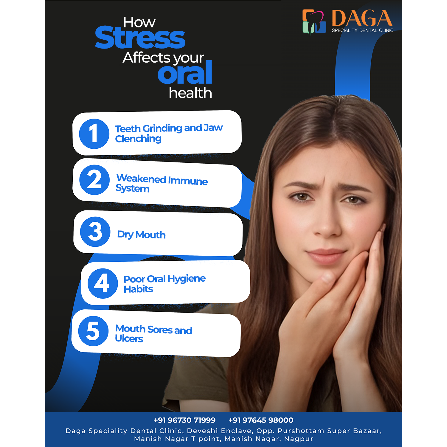 Discover how stress can harm your oral health from teeth grinding and dry mouth to mouth sores and weak immunity. Visit Daga Speciality Dental Clinic, Manish Nagar, Nagpur, for expert dental care and stress-related oral treatments. Call +91 96730 71999 or +91 97645 98000 for appointments.