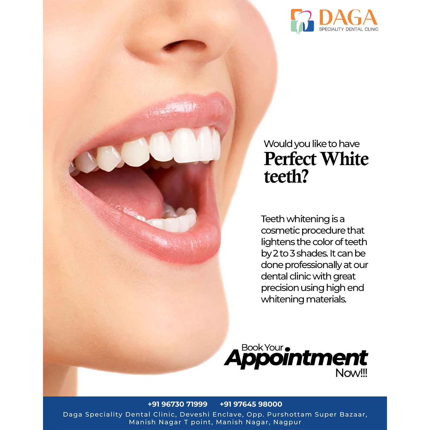 Get the perfect white smile you’ve always wanted! Daga Speciality Dental Clinic in Manish Nagar, Nagpur offers advanced teeth whitening treatments that lighten your teeth by up to 3 shades using safe, high-quality materials. Book your appointment today for a confident, brighter smile.