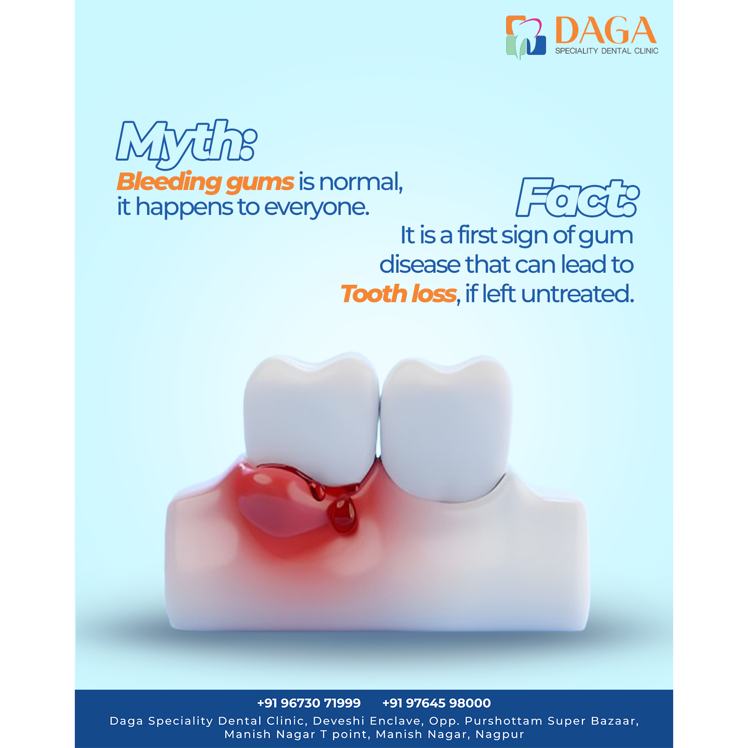 Don’t ignore bleeding gums! It’s an early sign of gum disease that can lead to tooth loss if untreated. Visit Daga Speciality Dental Clinic, Manish Nagar, Nagpur for expert gum care, dental cleaning, and oral hygiene guidance. Book your appointment today for a healthy smile!