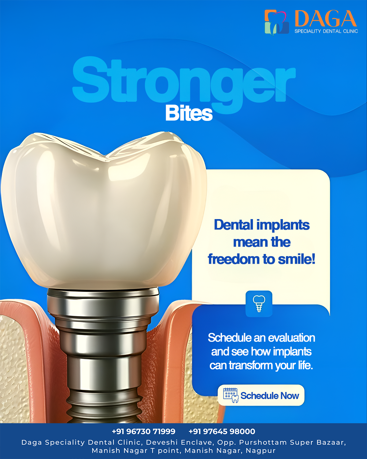 Looking for permanent tooth replacement in Nagpur? At Daga Speciality Dental Clinic, our advanced dental implant treatment gives you stronger bites and the freedom to smile confidently. ✔ Long lasting & natural looking implants ✔ Advanced technology & expert care ✔ Safe, precise & comfortable procedure Schedule your dental implant consultation today and transform your smile. 📍 Devshi Enclave, Manish Nagar T Point, Nagpur 📞 +91 96730 71999 | +91 97645 98000